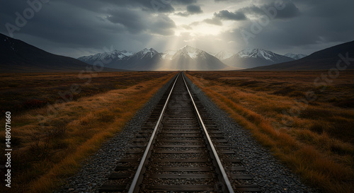 © Ruby, Fototapeta premium Symmetrical Train Rails Stretching to Icy Alpine Horizon