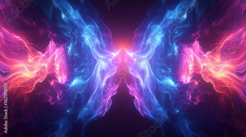 Obraz premium Symmetrical, vibrant abstract art depicting ethereal, glowing light and swirling forms