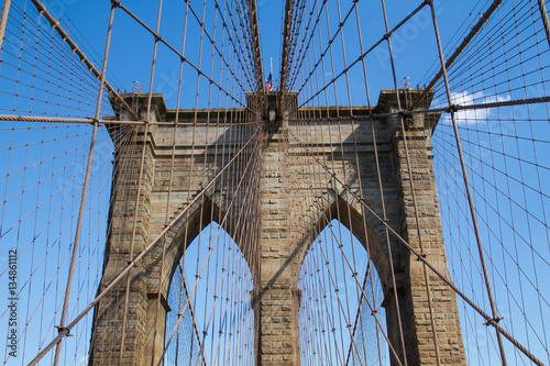 © Spinel, Fototapeta premium Symmetry of Brooklyn bridge and cable with blue sky, New York