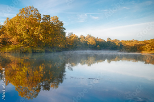 © aifeati, Fototapeta premium Symmetry reflection on the autumn river. Sunrise.