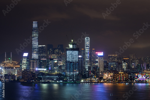 © danr13, Fototapeta premium Symphony of Lights in night Hong Kong. Illuminated skyscrapers and colorful reflection in water from city lights
