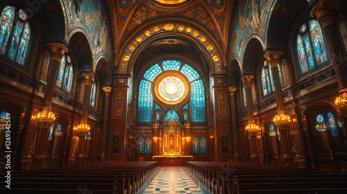 © Wararat, Fototapeta premium Synagogue interior adorned with intricate carvings and a glowing eternal light