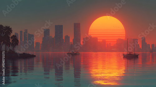 © john, Obraz premium synth wave retro miami city landscape background at sunset digital illustration