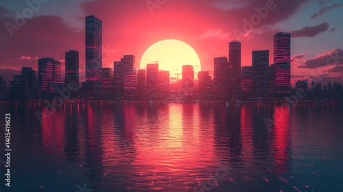 © atul _art, Obraz premium Synthwave Cityscape: Sunset Over Neon Skyline Reflection