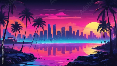 © Robiul, Obraz premium Synthwave style landscape with sea beach and silhouette modern metropolis in the background