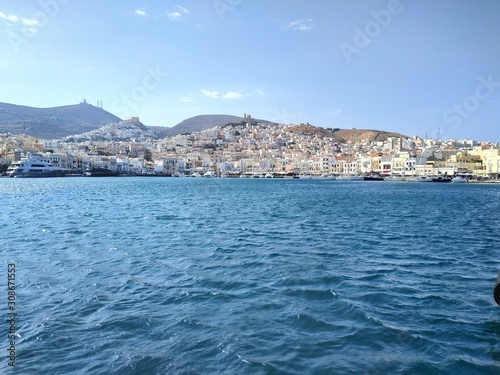 Fototapeta premium Syros, Greece view on the city from cruise chip at summer sunset light