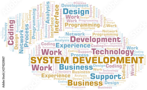 © sharafmaksumov, Obraz premium System Development word cloud. Wordcloud made with text only.