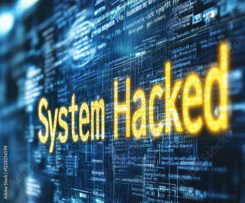 © Aliaksandr Barouski, Obraz premium System hacked message displayed on a digital interface with code background