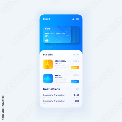 © IMG visuals icons, Fototapeta premium Szablon wektor interfejs smartfona portfela karty kredytowej. Strona aplikacji mobilnej biała z niebieskim układem. Ekran konta bankowego. Płaski interfejs użytkownika do aplikacji. Opłacone rachunki za dom. Wyświetlacz telefonu