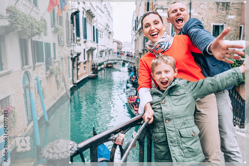 © Soloviova Liudmyla, Obraz premium Szalenie szczęśliwa rodzina robi sobie zdjęcie selfie na jednym z mostów w Wenecji. Podróżuj po świecie z obrazem koncepcyjnym dzieci