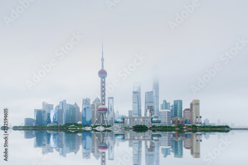 © Wang, Fototapeta premium Szanghai Chiny. W pochmurną pogodę budynki odbijają się w wodzie i przez chmury