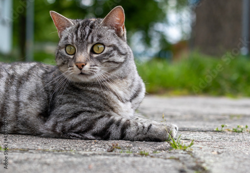 © Juliusz, Fototapeta premium Szary kot leżący na betonowym chodniku