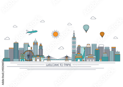 © lisakolbasa, Fototapeta premium Szczegółowe panoramę Tajpej. Tło podróży i turystyki. Tło wektor. ilustracja linii. Styl linii