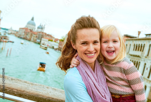 Naklejka premium szczęśliwa matka i dziewczynka na moście z grand cana