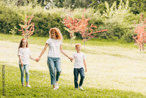 Obraz premium szczęśliwa matka z dwójką dzieci trzymających się za ręce i spacerów w parku