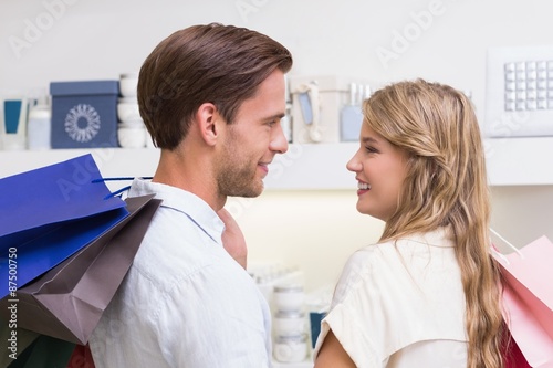 © WavebreakMediaMicro, Obraz premium Szczęśliwa para uśmiecha się w perfurmery