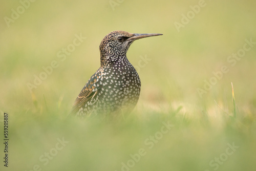 Fototapeta premium Szpak na zielonej łące w zimowej szacie.