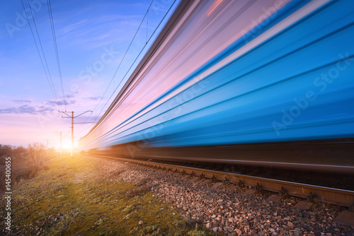 Fototapeta premium Szybki niebieski pociąg pasażerski w ruchu na kolei o zachodzie słońca. Niewyraźne nowoczesny pociąg podmiejski. Dworzec kolejowy i kolorowe niebo. Podróże koleją, turystyka kolejowa. Wiejski krajobraz przemysłowy w zmierzchu.