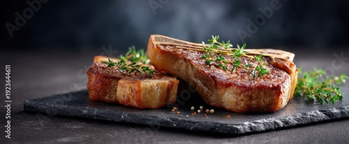 © ckybe, Fototapeta premium T-bone steaks with thyme on a rustic slate platter against a dark backdrop.