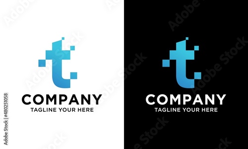 © butuh, Obraz premium T Huruf Pixel Desain Logo Motion, T tech, letter T data logo design technology. on a black and white background.