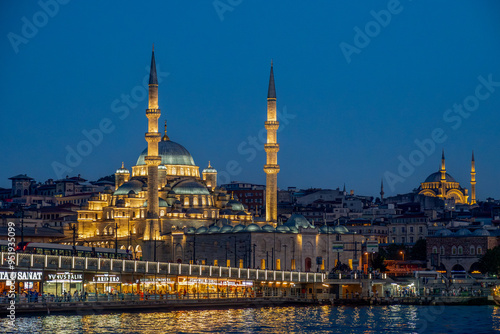 Naklejka premium Türkiye. Istanbul. The new mosque or Valide Sultan Camii with the Galata bridge and ın the background the suleymaniye mosque at dusk