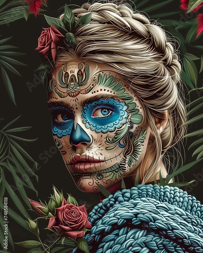 © Bonya Sharp Claw, Naklejka premium T-shirt applique design. Portrait of a girl wearing makeup in honor of the Day of the Dead. Chicano style.