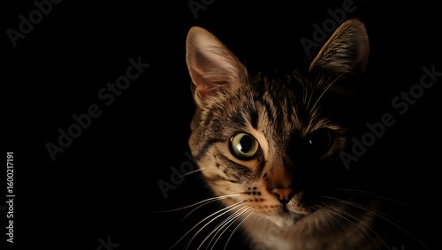 © Active Abdur Rouf, Obraz premium Tabby cat face with green eyes peeking from darkness feline animal