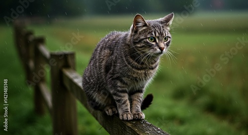 Fototapeta premium Tabby Cat Sitting on Wooden Fence in Rain Green Field Background Pet Animal