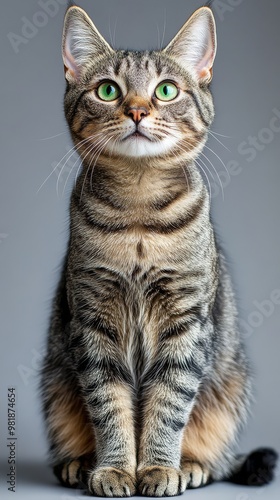 © KP, Obraz premium Tabby Cat with Green Eyes Looking Up.