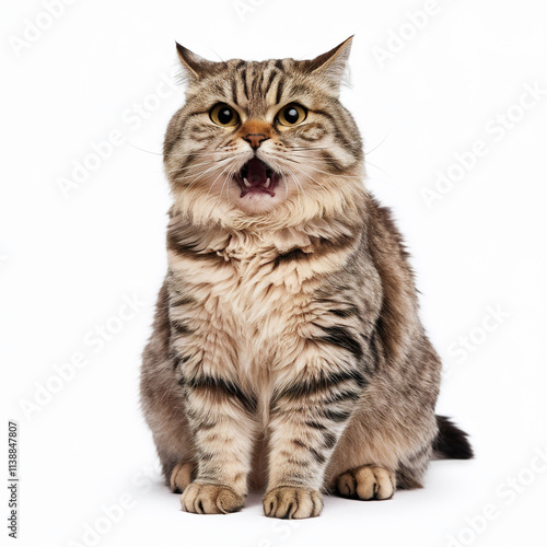 Obraz premium Tabby Cat With Open Mouth Sitting On White Background