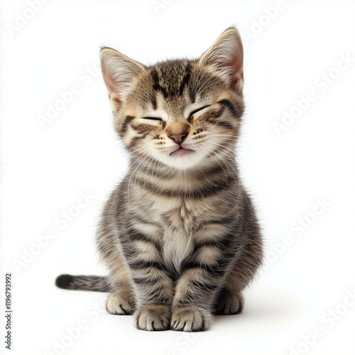 Fototapeta premium Tabby kitten sleeping with closed eyes on white background