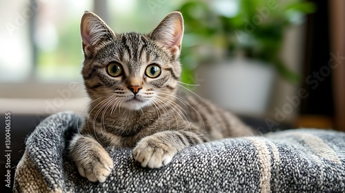 © Sayla, Obraz premium Tabby Resting on Blanket by Window Sill
