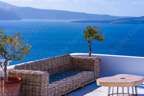 Obraz premium Table and sofa on a tarrace with view of Aegean Sea in Oia. Santorini, Cyclades, Greece