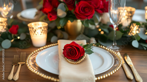 © Vika art, Fototapeta premium Table decoration with red roses.