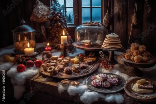 Naklejka premium table filled with various cakes and pastries displayed next to a sunny window Generative AI