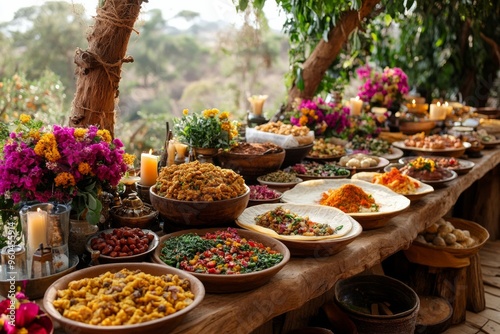 © Anastasiia S, Fototapeta premium Table in nature with traditional Ethiopian dishes such as injera, doro wot, mesir wot, decorated with flowers. Concept Ethiopian New Year