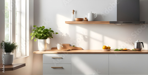© phimprapha, Fototapeta premium Table of free space and kitchen interior. White wall with shadows and sunny warm morning time.