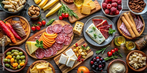© Udomner, Fototapeta premium Table setting with a variety of snacks, cold cuts, assorted bars, and cheeses. View from above, buffet, table, setting