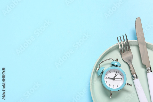 © Pixel-Shot, Fototapeta premium Table setting with alarm clock on blue background. Intermittent fasting concept