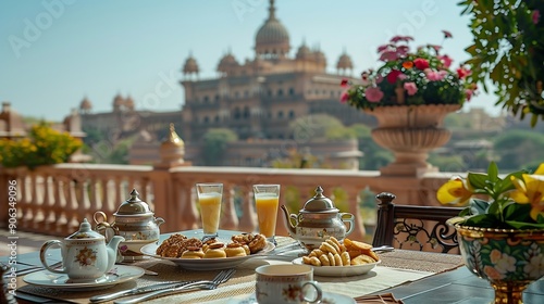 Fototapeta premium Table with a Continental breakfast on the terrace of the Umaid Bhawan Palace in Jodhpur Rajasthan India Asia : Generative AI