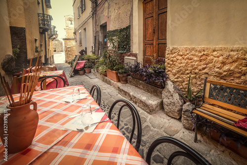 Naklejka premium Tables and chairs in a narrow alley in old town Castelsardo
