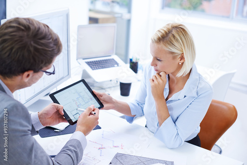 © Beak Joint/peopleimages.com, Obraz premium Tablet, blueprint screen or architect with engineer planning in meeting for engineering project. Architecture strategy, teamwork or designer on technology for digital app or floor plan development