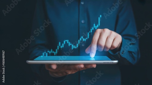 Fototapeta premium Tablet displaying a rising financial chart with a finger touching the screen for analysis.