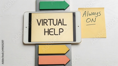 © Wan Haniza, Naklejka premium Tablet showing Virtual Help with arrows in flatlay layout