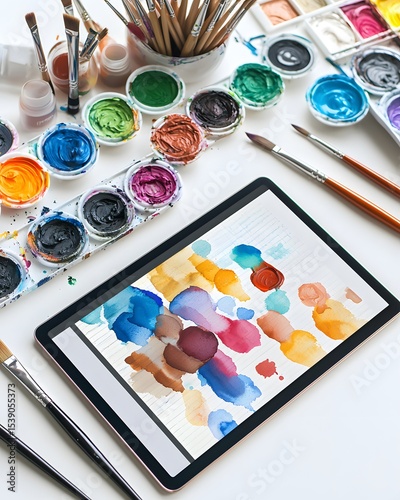 © Atthapon, Naklejka premium Tablet with a drawing of a colorful swirl of paint on it