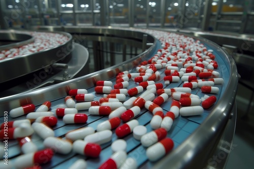 Obraz premium Tablets in the process of production and packaging at a modern pharmaceutical...