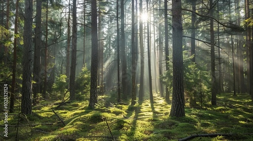 Obraz premium Tack-sharp capture of an ancient pine forest, sunbeams, forest floor detail,