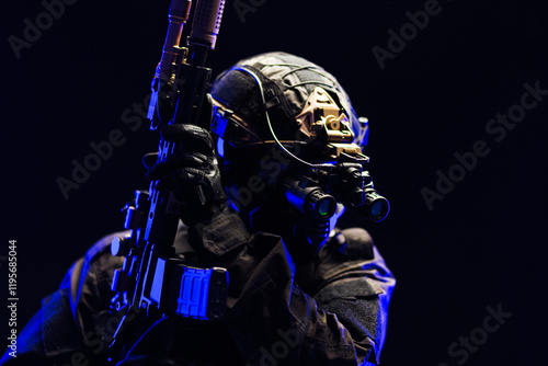 © Nikola Spasenoski, Naklejka premium Tactical Soldier Equipped with Night Vision Gear Holding Weapon in Dark