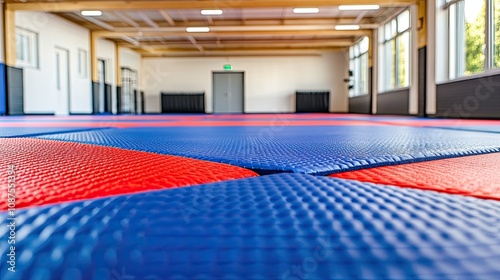 © Pannin, Naklejka premium Taekwondo field indoors with blue and red mats in a clean, empty gym, perfect for training or competition preparation.