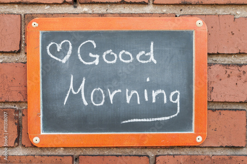 Fototapeta premium Tafel an einer Ziegelwand mit Text / Tafel an einer Ziegelwand mit Text Good Morning.